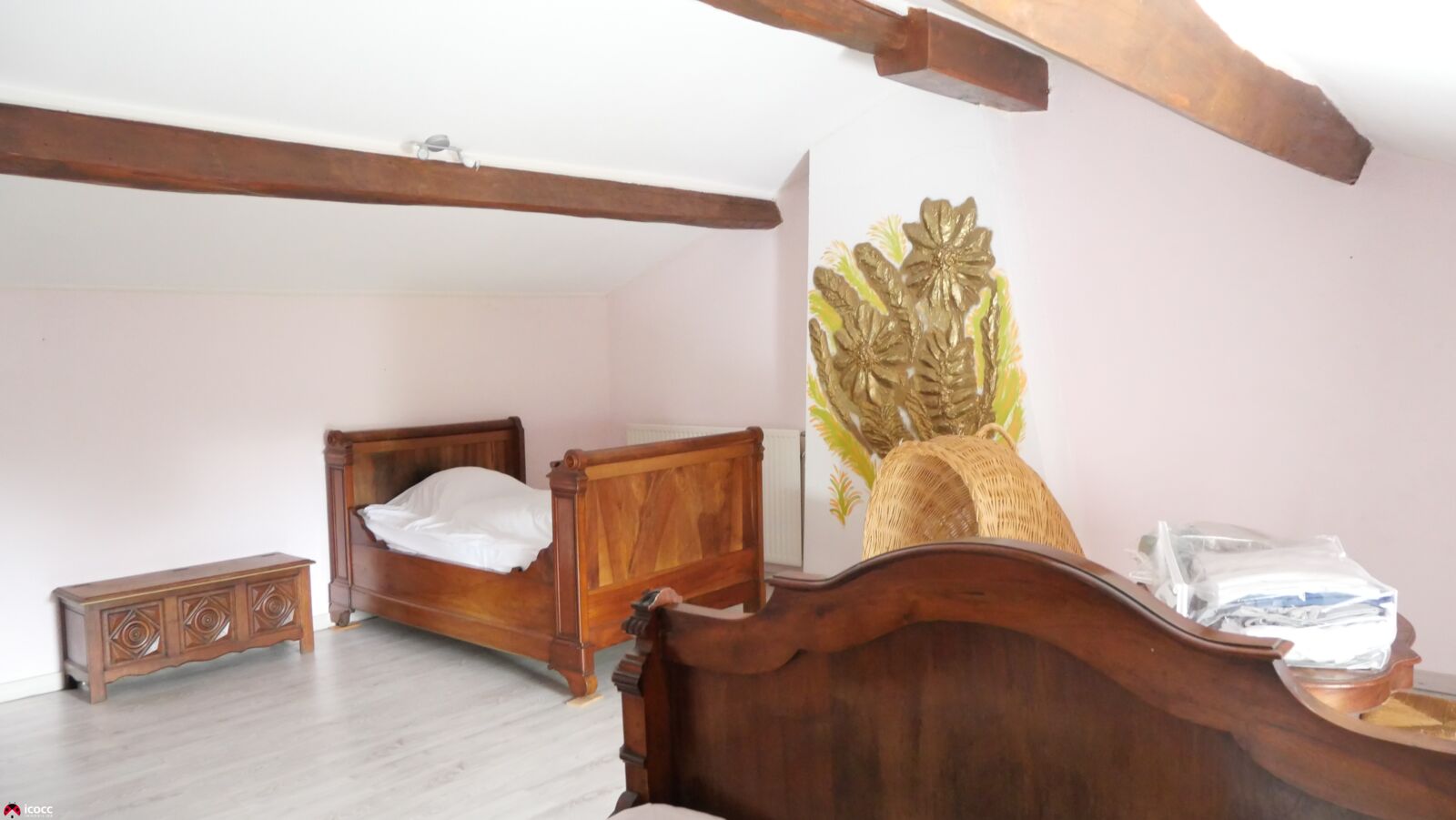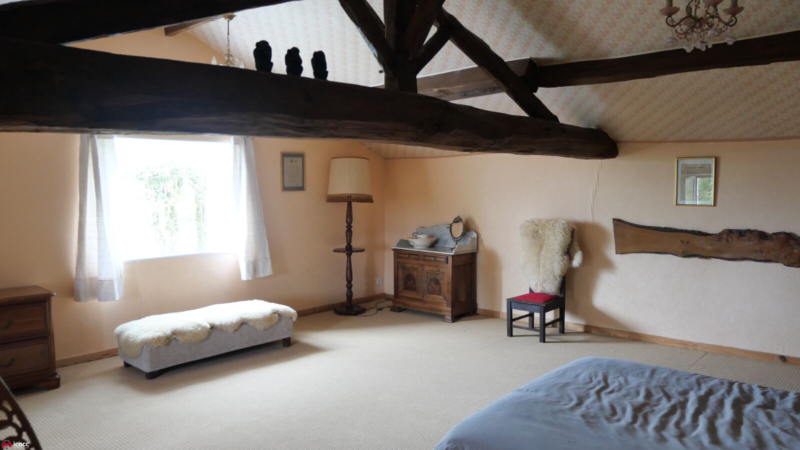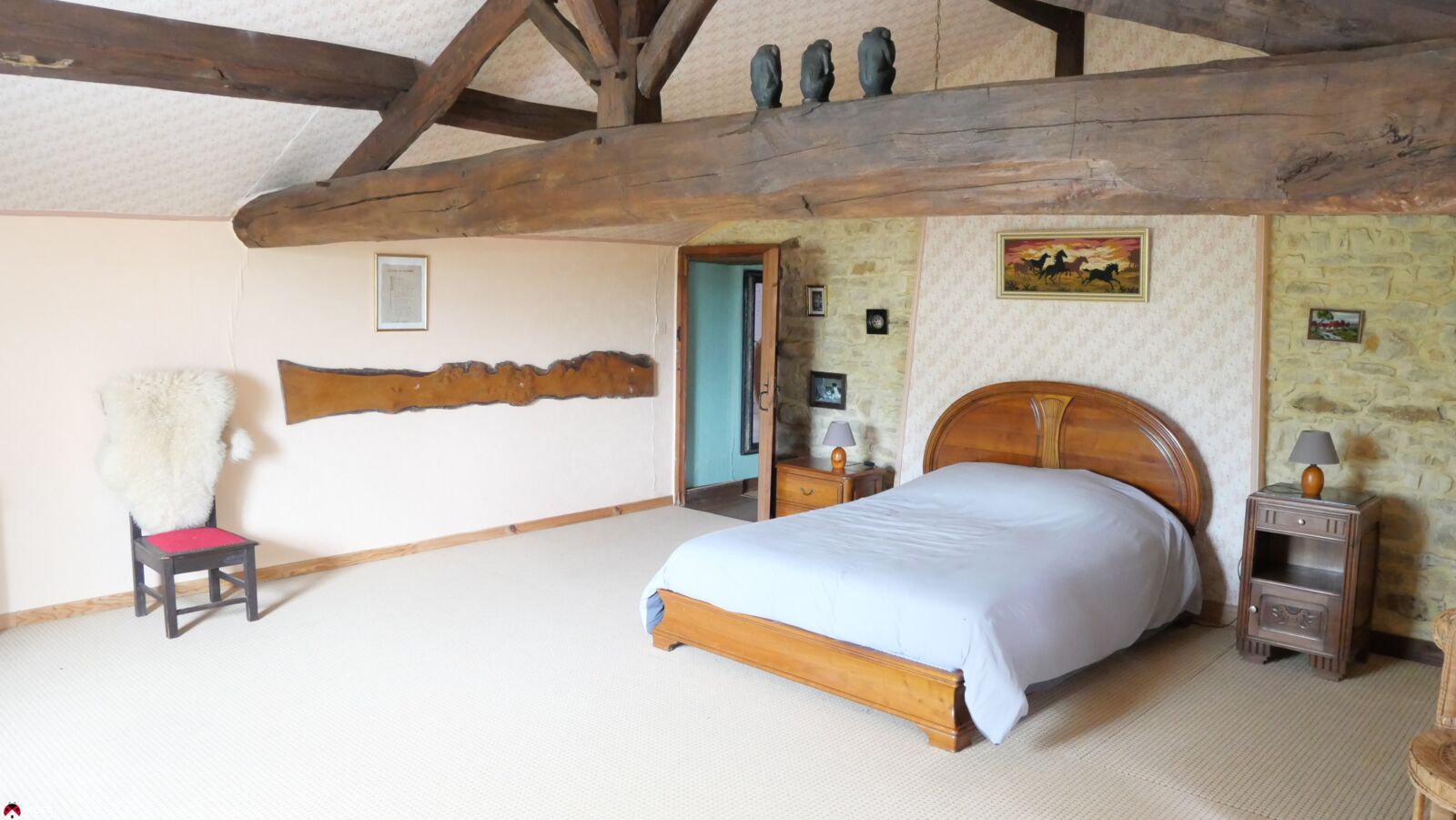 A l'étage, 2 grandes chambres de 33 m2 et 28 m² avec poutres apparentes.