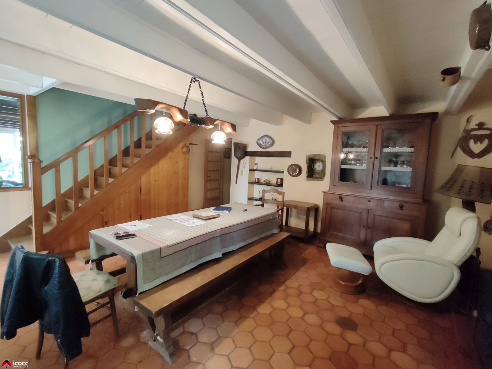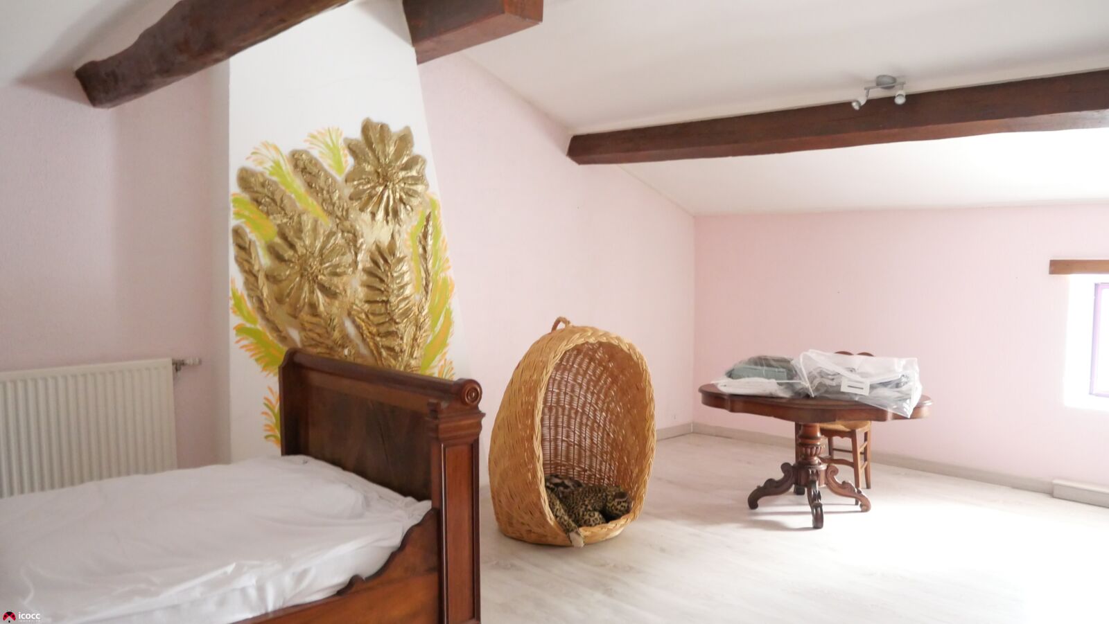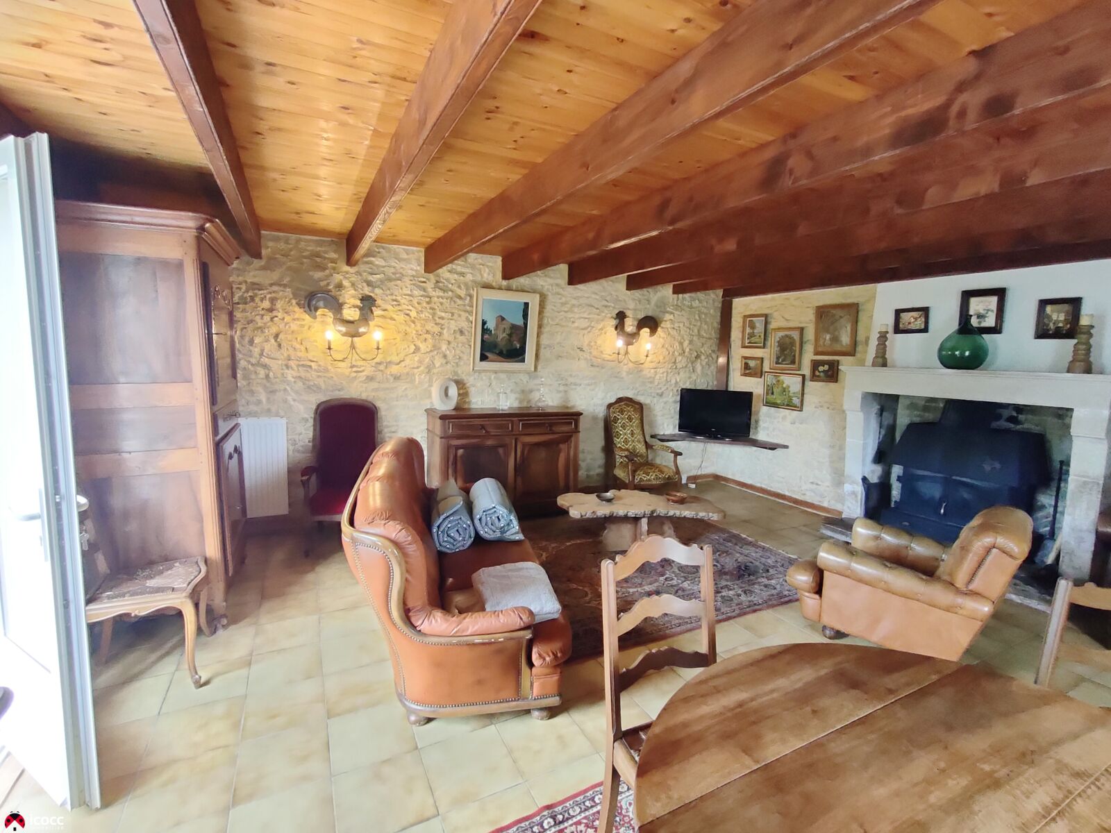 A l'étage, 2 grandes chambres de 33 m2 et 28 m² avec poutres apparentes.