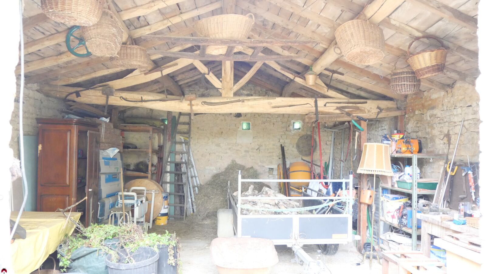 A l'extérieur on trouve de nombreuses dépendances (toit à cochon) avec notamment un beau garage/grange de 39 m² ainsi qu'une dépendance de 40 m² aménagée en salle de jeux.